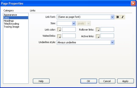 По подразбиране шрифта на хипервръзките е същия какъвто е шрифта на останалия текст на уеб страницата. Ако искате да промените това използвайте полето Link font. Размера на шрифта може да промените в следващото поле – Size. Цвета на хипервръзката се определя в полето Link color. Промяната се извършва като натиснете стрелката на квадратчето и изберете цвят. Полето Visited links определя цвета на посетените хипервръзки. В полето Underline style определяте кои хипервръзки да бъдат подчертани.
