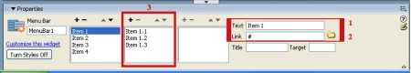 В полето, означено с 3, е подменюто на първия бутон. Бутоните от подменюто се надписват по същия начин и по същия начин им се слагат връзки, както описах преди малко за бутоните. Броят на бутоните в подменюто може да се променя, като се използват знаците + и -. Ако искате да изтриете например Item 1.3, изберете с мишката Item 1.3 и след това натиснете върху -. Като натиснете + се добавят бутони в подменюто. Може да изтриете всички бутони в подменюто, както и да създадете подменю на бутон, който е бил без подменю.